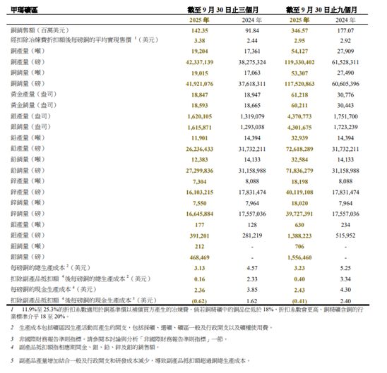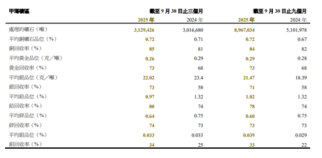 于截至2025年9月30日止三个月,甲玛矿区的铜产量为19,204吨(约42.3百万磅),较2024年三个月同期的17,361吨(约 38.3百万磅)增加。