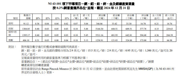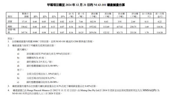 NI 43-101 项下于 2024 年 12 月 31 日按类别划分的甲玛项目矿产储量: